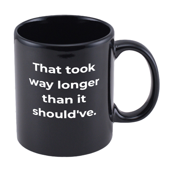 Great quality Mug with the Cobweb Garage logo on one side, and “That took way longer than it should’ve.” on the other.
